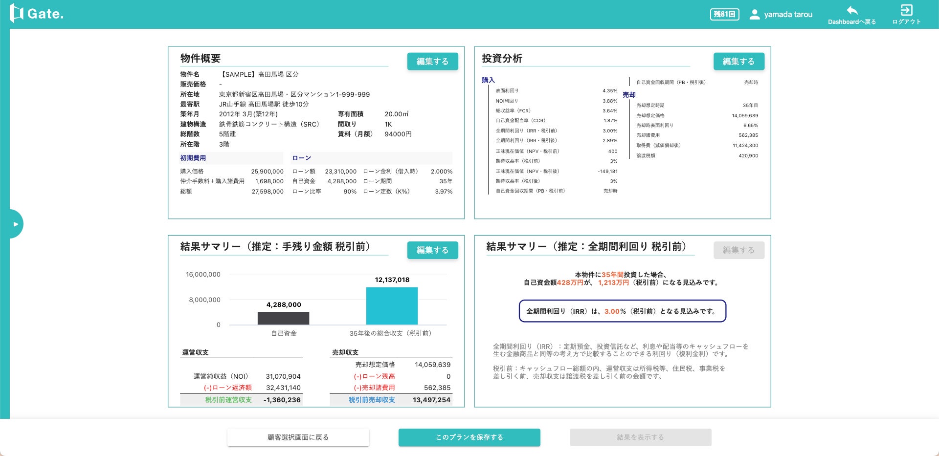 不動産価値分析AIクラウドサービス「Gate.」は2008年から独自に収集した2億5,000万件を超える物件データ(2024年3月時点)をもとに、人工知能を活用した不動産の査定・投資分析シミュレーションや市場分析・ハザード情報の提供を行っています。