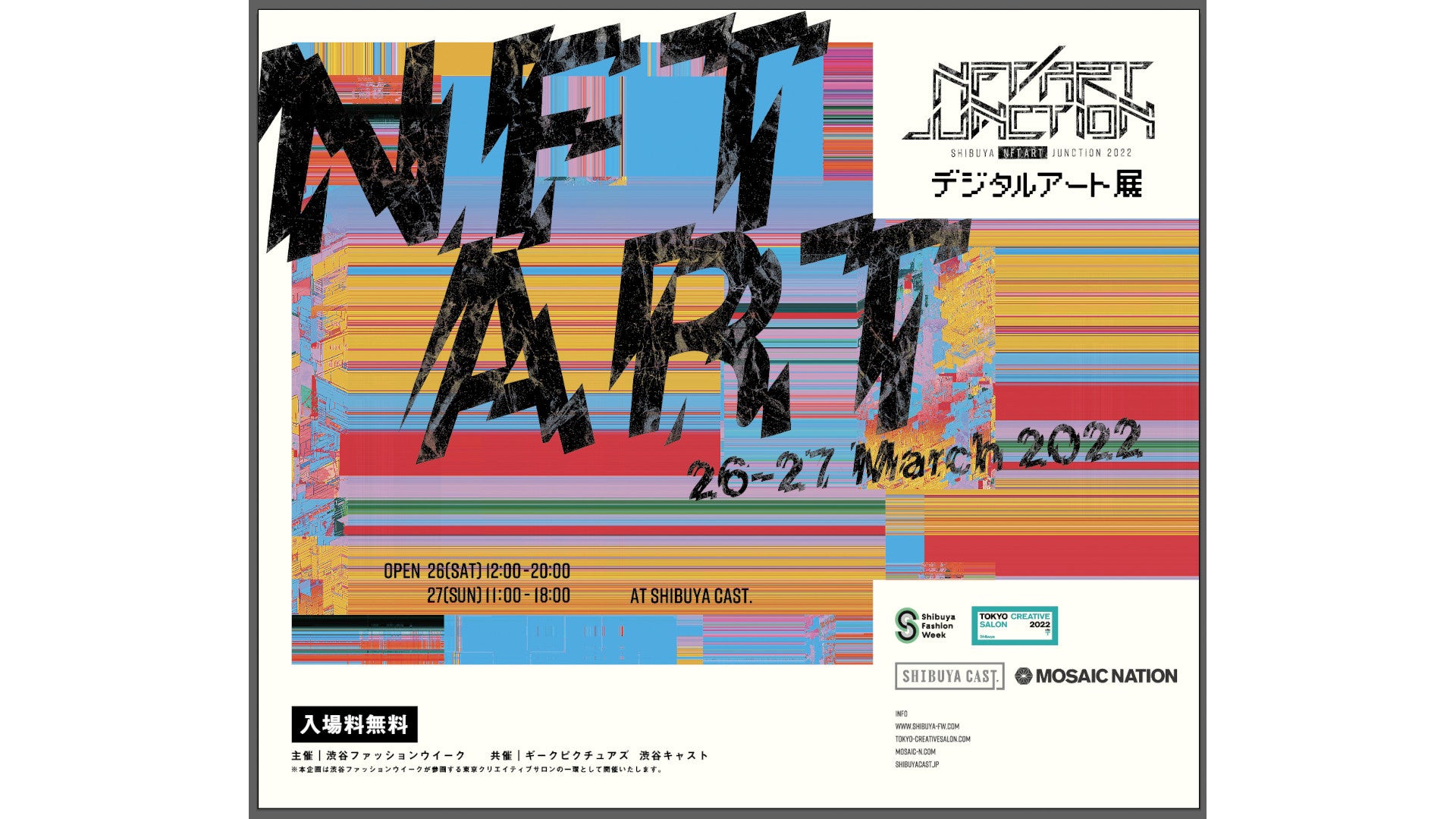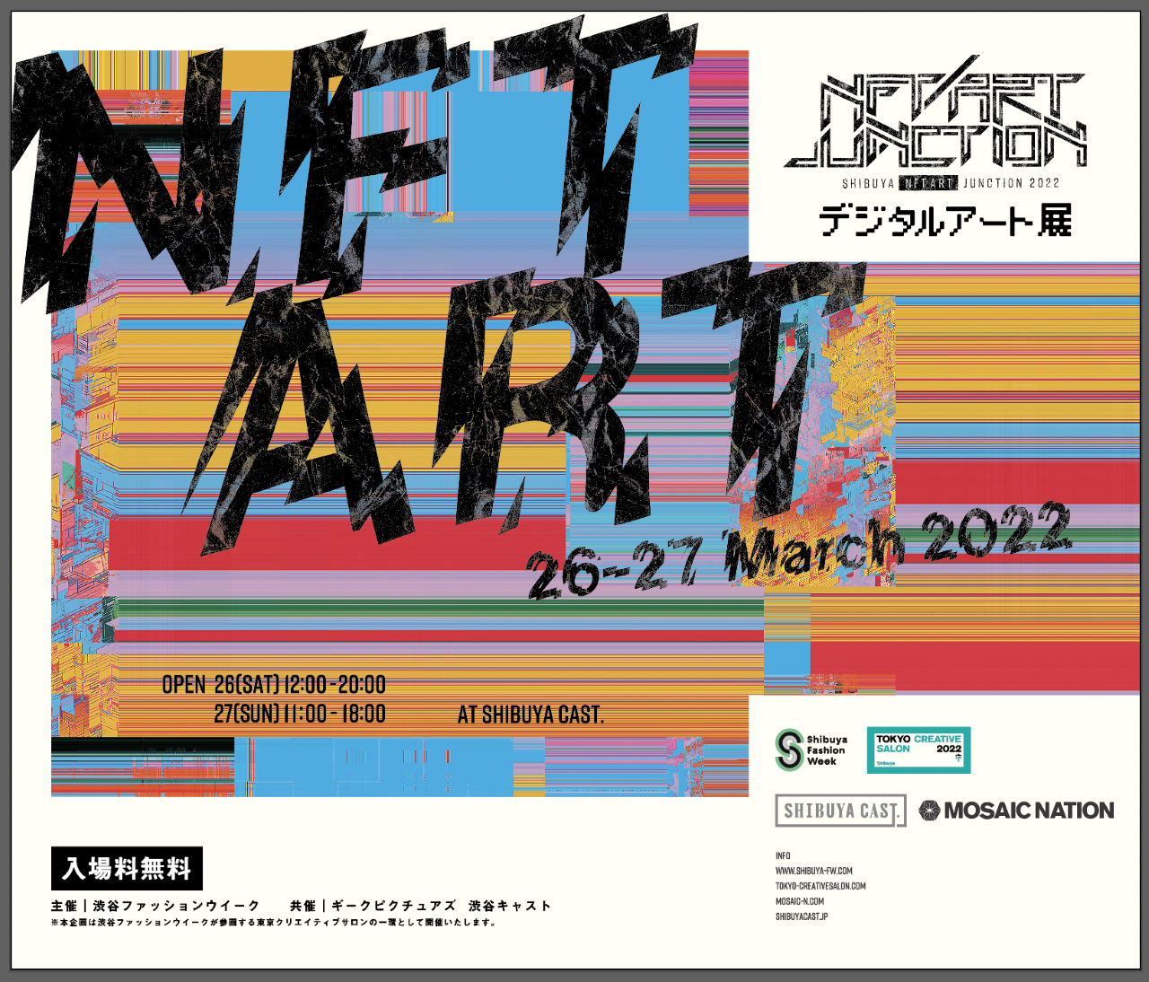 地域や民間企業が連携して、ファッション、アート、音楽、フード、カルチャーなど、様々なカテゴリーのイベントが一堂に集結する「東京クリエイティブサロン」内で開催される本イベントは、世界でも注目されているNFTアート・ファッションに注力した展示会です。作品が世に出る場を提供し、アーティストの支援、アート界の活性化を目的としており、渋谷から世界に発信します。会場となる「SHIBUYA CAST.」では、NFTプラットフォーム「MOSAIC NATION」(https://mosaic-n.com/) が厳選した作品が展示され、デジタルで購入できます。