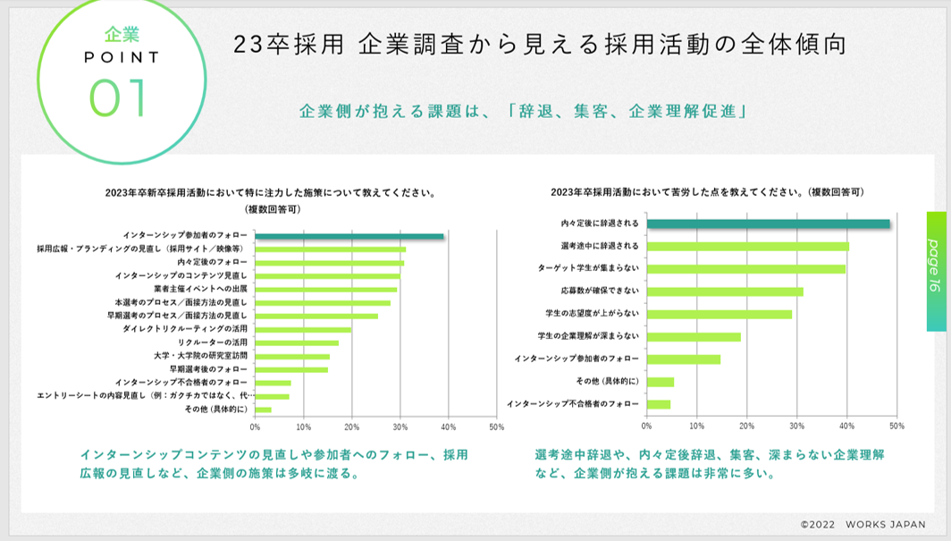 企業はインターンシップコンテンツの見直し、リクルーター/社員活用を重視。