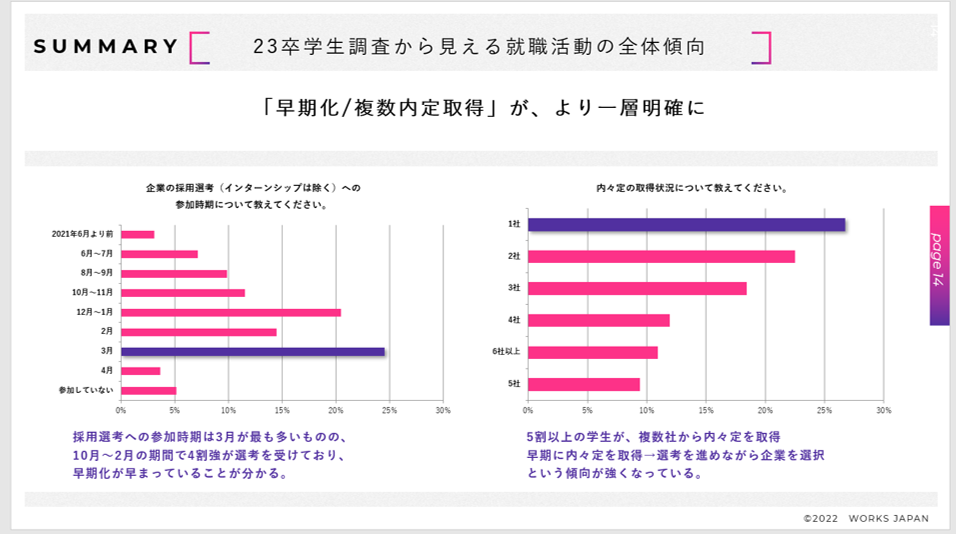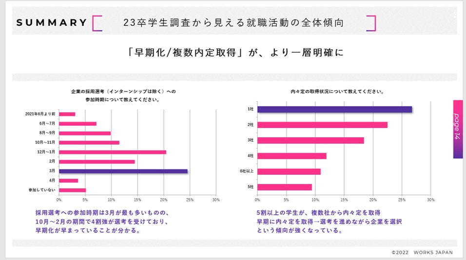企業の採用を支援する株式会社ワークス・ジャパン(本社:東京都千代田区、代表取締役:清水信一郎、以下 ワークス・ジャパン)は、2023年3月卒業・修了予定の大学生、大学院生を対象に、就職活動動向調査を実施致しました。併せて、企業の人事担当者を対象に採用活動動向調査も実施致しましたので、結果のご報告を致します。