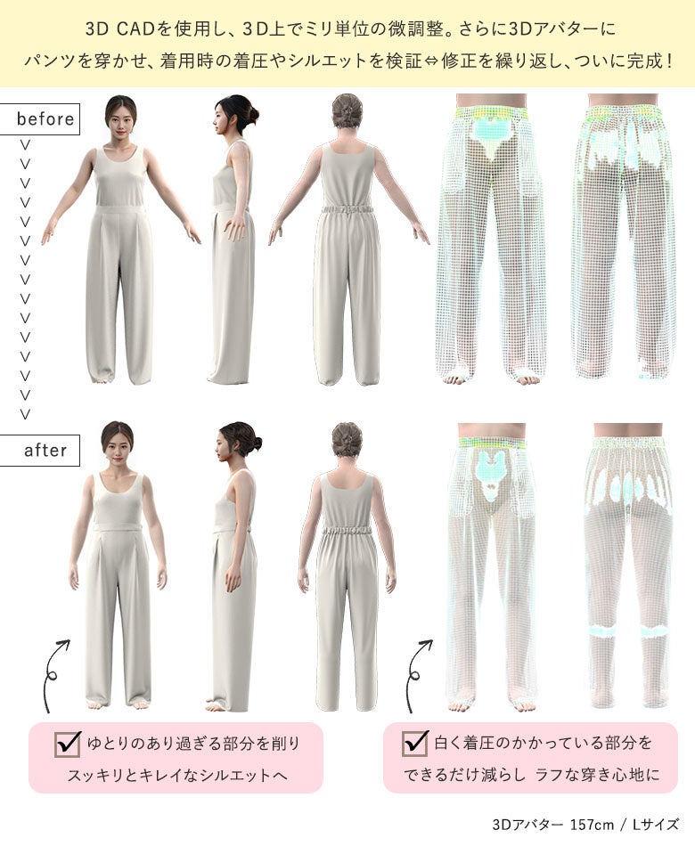 50代の平均的な体型3Dアバターにパンツのパターンを穿かせて、着圧のかかっている部分やゆとりが出すぎている部分などを、3D上でミリ単位の微調整。作成したサンプルをリアル世代のスタッフが着用し、気になる部分がなくなるまで修正を繰り返しました。