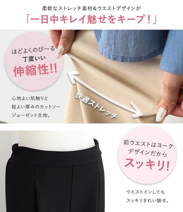 ストレッチとジョーゼット素材の特性が、3Dパターンと合わさることでシワになりにくく、一日中キレイ魅せをキープしてくれます。