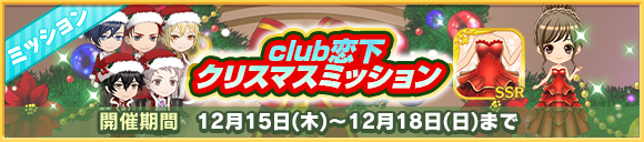 ★12⽉15⽇(木)から開催する『club恋下クリスマスミッション』はclub恋下営業中に、メッセージで「好き」と彼に送ろう♪いつもより沢山愛の言葉を伝えて、クリスマス限定、特別なSSRセレブルビードレスをゲットして彼とのクリスマスデートに備えよう♡