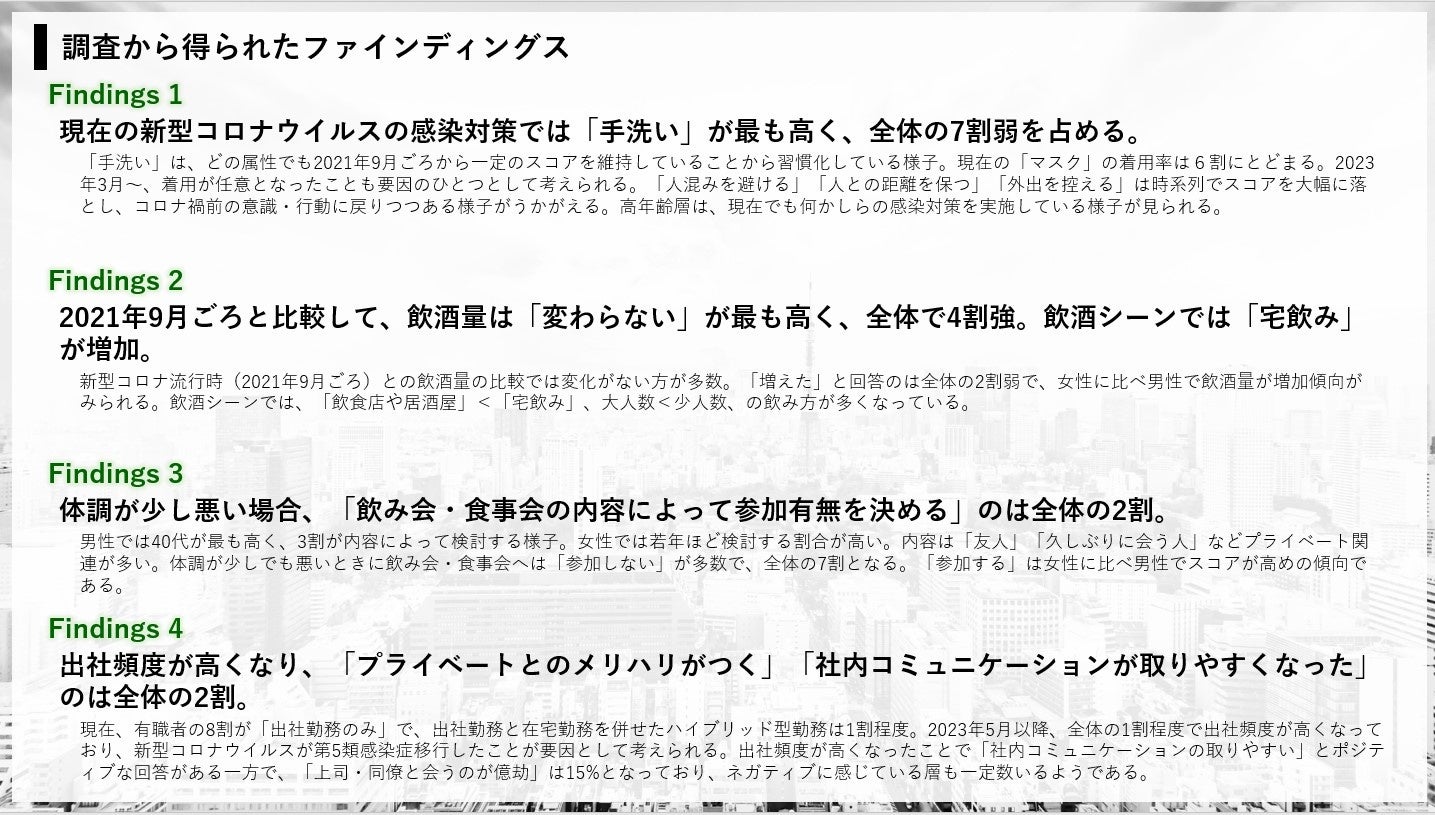 そこで、日本インフォメーション株式会社(代表取締役社長:斎藤 啓太 以下、日本インフォメーション)では、新型コロナウイルスに対する感染対策などの行動や意識を、「2021年9月頃(第5波 デルタ株蔓延時)」「2023年5月頃(「第5類感染症」に移行時)」と比較し、現在の状況を把握するために調査を実施しました。また、今回の調査では、新型コロナウイルスによって変化した飲酒シーンや働き方の現状把握も行いました。
