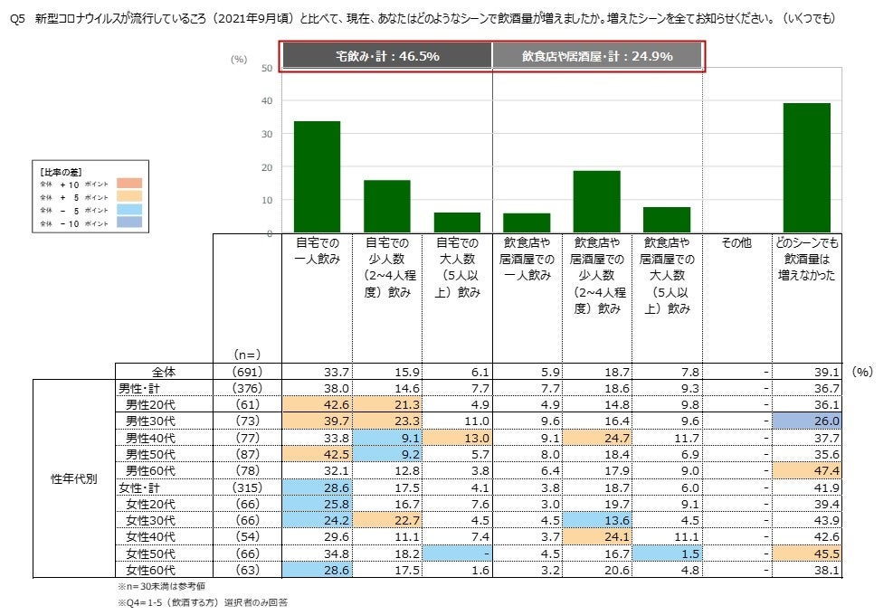 ・飲酒が増えたシーンでは、全体では「自宅での一人飲み」が最も高くなっています。
