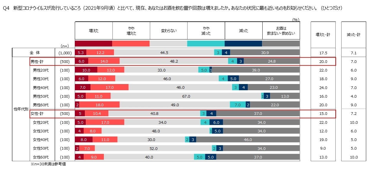 ・性別で見ると、女性に比べて男性で飲酒量が増えた傾向がみられます。