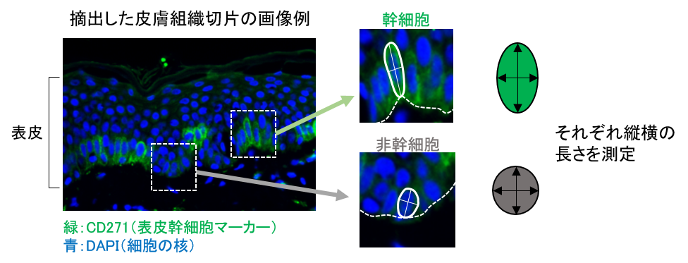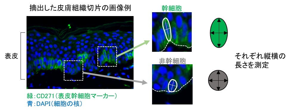 そこで今回の研究では、20~80代の人の皮膚組織(20検体)に存在する表皮幹細胞と、角化細胞を含めた非幹細胞の形状(細胞の大きさや形など)について詳細に解析しました。