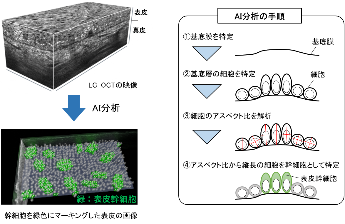 LC-OCTは、組織の内部構造を細胞レベルでイメージングすることが可能です。そこで、先に解析した表皮幹細胞の形状に関するデータをもとに、形状から表皮に存在する幹細胞を見極める独自AIを開発し、LC-OCTで得た映像を今回のAIで分析することで、基底膜上に存在する表皮幹細胞を予測し可視化する技術を開発しました。