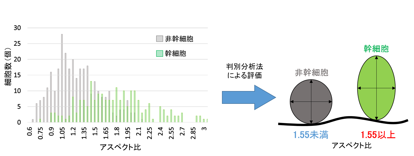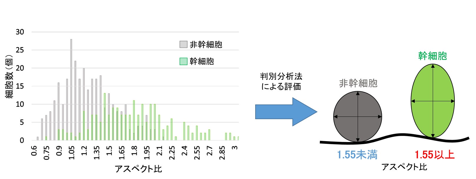その結果、表皮幹細胞の高さの平均値は約12.50 μm、横幅の平均値は約7.56 μmであるのに対し、角化細胞の高さは平均値は約9.60 μm、横幅の平均値は約8.32 μmでした。解析した各細胞のアスペクト比(縦横比)を算出し、判別分析法による評価を行った結果、アスペクト比が1.55以上の細胞が表皮幹細胞として判断できることが分かりました。つまり、肌内部に存在している表皮幹細胞は角化細胞に比べて縦方向に長いラグビーボール状の形状をしていることが明らかになりました。