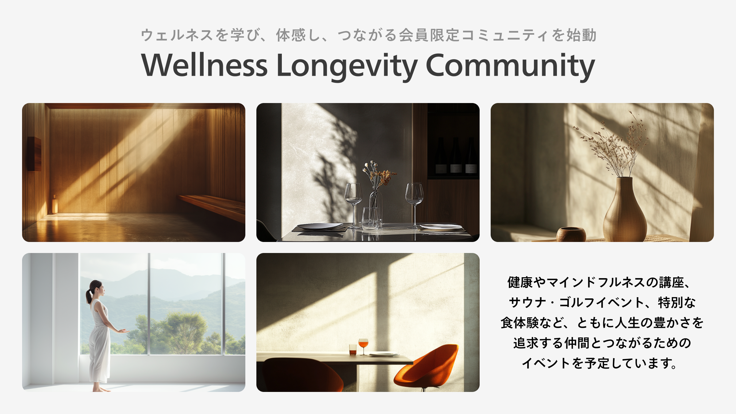 世界中の情報や人と気軽に接続できる現代社会は便利な半面、人と人の繋がりが希薄になりやすくなったと感じています。これまで会員制社会人コミュニティの運営に携わり運営統括も務めた経験から確信しているのは「信頼性が担保されたコミュニティでは、家族や会社以外の新たな居場所(=サードプレイス)を提供できる」ということです。「Wellness Longevity Community」では、健康意識の高い方々が集い、ビジネスを超えた深いつながりを育む場を創りたいと考えております。