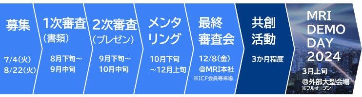 1次・2次審査にてファイナリスト(最終審査会に進出する企業)を選考し、当社研究員がメンタリングを実施後、最終審査会に臨んでいただきます。その後、提案ビジネスとMRI・ICF会員との共創活動を実施、共創成果があがった企業には公開イベント「DEMO DAY」において発表していただきます。なお、ファイナリストとの共創活動においては、MRIからの出資を含む協業・連携に進む場合があります。