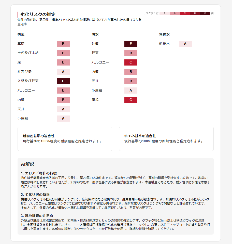 ・住所・建物構造・築年数を入力することで、構造や雨漏りなどに関する劣化リスクを推定