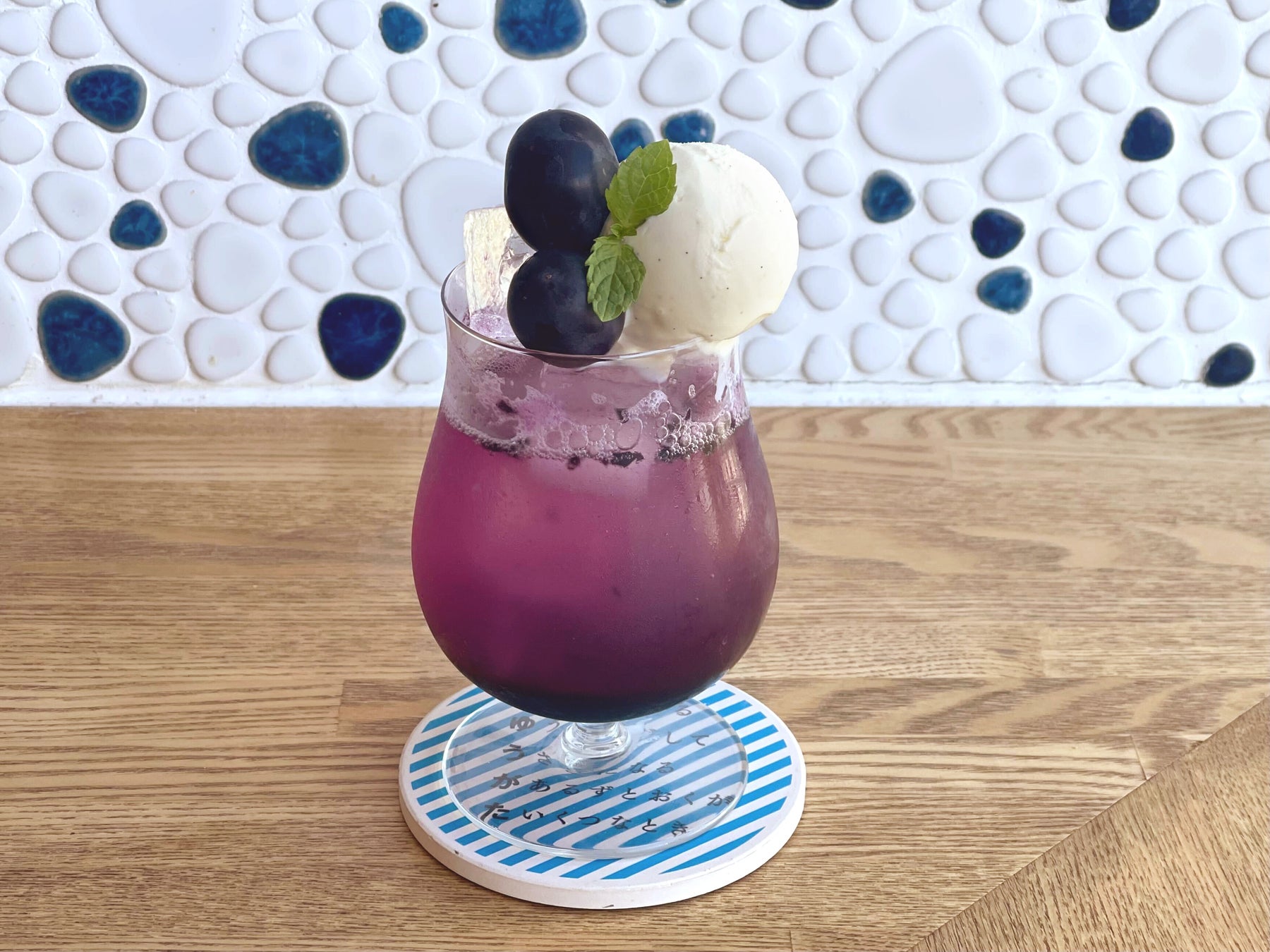 自家製の巨峰果肉ソースとおろしぶどうシロップをソーダで割りました。果肉感があり、濃い巨峰を感じられます。濃厚なバニラアイスを使用しており、溶けて巨峰ソーダと混ざり合うとクリーミーなバニラと濃い巨峰がとってもよく合います!甘すぎずさっぱり濃厚なクリームソーダです。