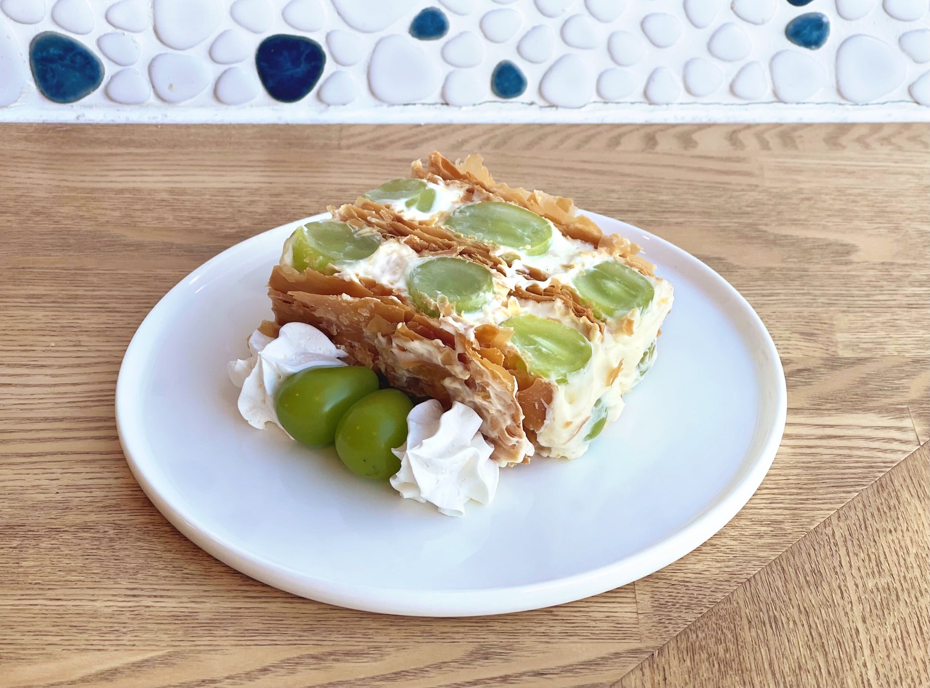 さっくり香ばしいパイと濃厚な甘味のカスタードクリーム、シャインマスカットが贅沢にたっぷりと詰まったナポレオンパイ!中にもごろっとシャインマスカットは全部で11粒使用.。年に数回しか登場しない自由形のナポレオンパイはとってもレアです!是非旬のシャインマスカットと合わせてお楽しみください!
