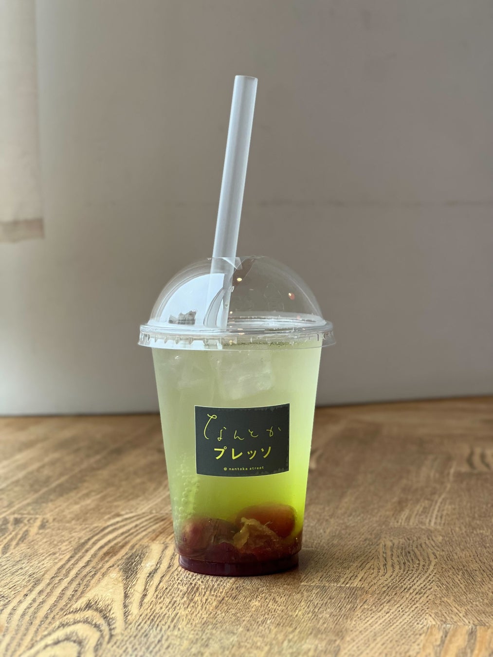 マスカットシロップと自家製のぶどうジャムと凍らしたぶどう果肉入り!飲みごたえのある秋の炭酸ドリンク。