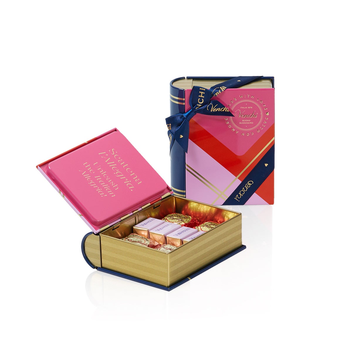 毎年人気のミニブック缶の2025年バレンタイン限定バージョン。チョコレート3種類8粒をアソート。