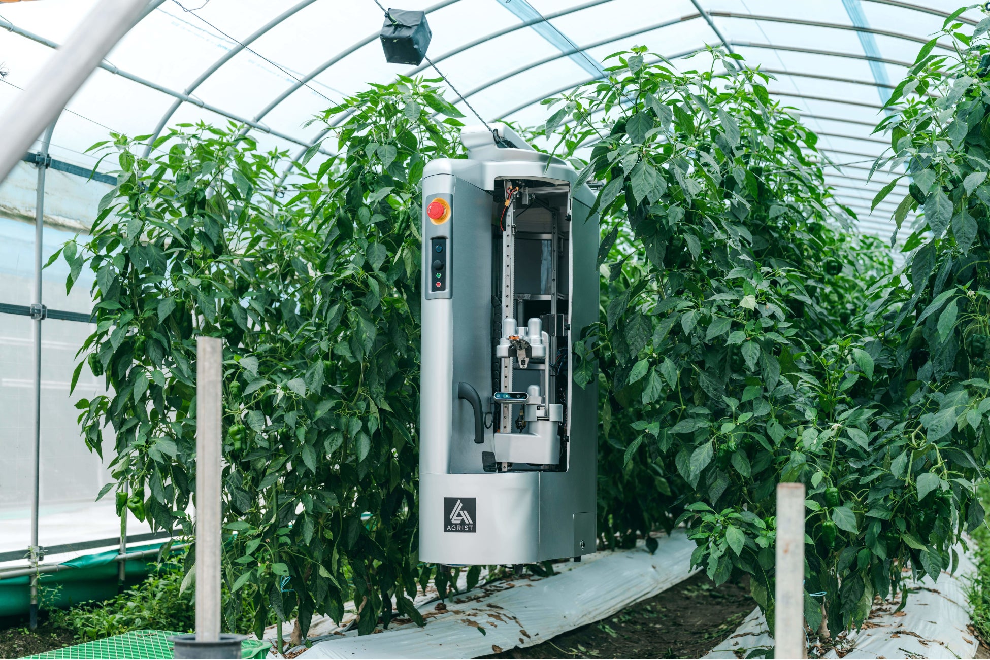 目下開発を手掛けているピーマンの自動収穫ロボット「L」(エル)は、発売開始を今秋に控えています。初期費用150万円からと比較的安価で導入しやすいのが特徴で、「収穫開始」ボタンを押すだけで、ワイヤー吊り下げ式でビニールハウス内をロボットが巡回、AIとセンサーで実の大きさを判定し収穫します。一定量以上収穫したら、溜めたピーマンをコンテナに放出し、再び収穫して回ります。