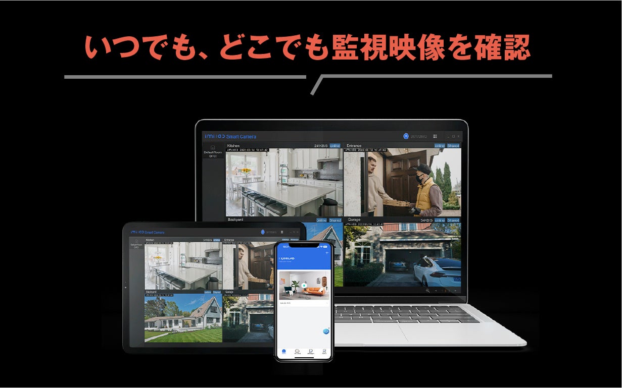 スマホアプリとの連携することでスマホ、タブレット、PCからいつでもどこでも、リアルタイムに監視映像を確認することができます。またカメラの設定をカスタマイズすることもできます。