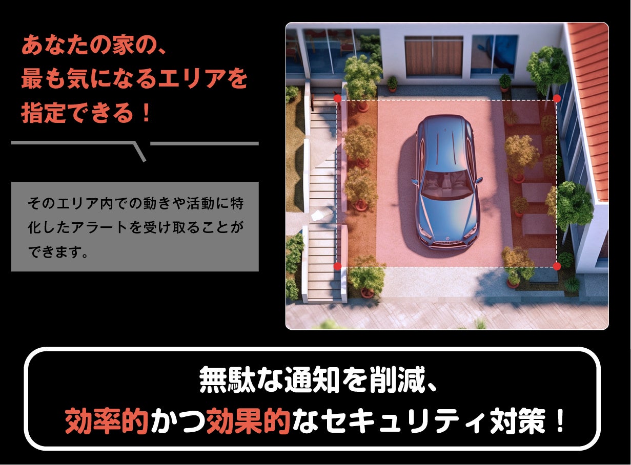 設定したエリア内の活動や動きを集中的に監視。エリア内での動きや活動に特化した通知を受け取ることができます。全体的な監視の中でも特に重要なエリアに焦点を当てることで、不要な通知を減らし効率的かつ効果的なセキュリティ対策を行うことができます。※日本版製品ではアプリも日本語になっています。