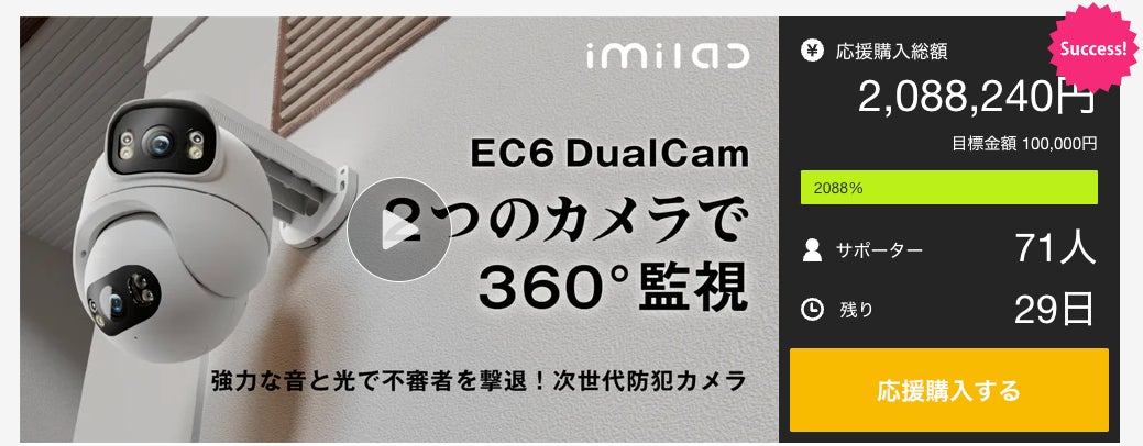 ルタワジャパン株式会社は、2024年3月1日、AI搭載次世代防犯カメラ「EC6 DualCam」がMakuakeにて応援購入総額200万円を達成しましたことをお知らせします。