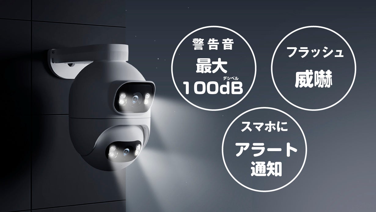 【100dBのスマートサイレンとフラッシュが不審者を威嚇】