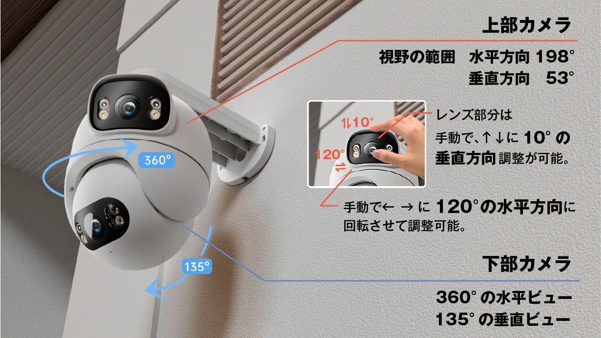 上部カメラのレンズの視野は水平方向198°、垂直方向53°。さらに手動調整でカメラの向きを水平方向120°垂直方向に10°調整することができます。