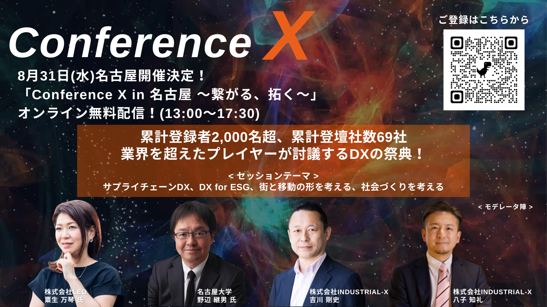 デジタルトランスフォーメーション(DX※1)推進を行う、株式会社INDUSTRIAL-X(本社:東京都港区、代表取締役CEO:八子 知礼、以下INDUSTRIAL-X)は、8月31日(水)にDXの先にある “産業の未来” を描き、発信するビジネスカンファレンス「Conference X in 名古屋 2022」を開催します。この度は、追加登壇者および協賛の決定と、各セッション内容の先行公開をお知らせいたします。