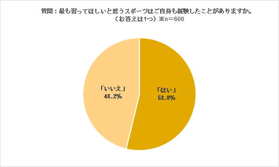 ランキングに合わせて、日本全国の子育て世代の親がもつ習い事に対する意識も調査しました。親が習ってほしいと思うスポーツは、自身も経験したことがあるかを質問したところ、「はい(323票)」と答えた人が53.8%、「いいえ(277票)」と答えた人が46.2%でした。