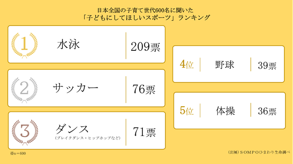 最も習ってほしいと思うスポーツは「水泳」、ブレイクダンスなど最近注目を集める「ダンス」が3位に!