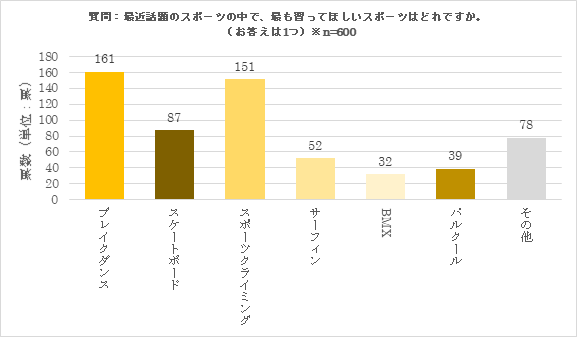 また「最近話題になっているスポーツの中で、最も習ってほしいスポーツはどれかですか」という質問においては、「ブレイクダンス(161票)」の他に、第2位の「スポーツクライミング(151票)」や、第3位の「スケートボート(87票)」など、「ブレイクダンス」の人気を含めてアーバンスポーツ※の盛り上がりが伺える結果でした。(【参考資料】参考2参照)。