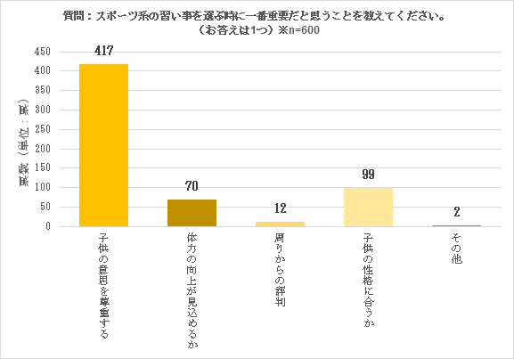 自分自身の経験から「子どもにも同じスポーツを習わせたい」という親が全体の半数以上(53.8%)だったものの、スポーツ系の習い事を選ぶ時に最も重要だと思うことを質問したところ、「子どもの意思を尊重すること」が417票を獲得し最も多い結果になりました。次に「子どもの性格に合うかどうか(99票)」という回答が多く、子どもの興味関心を一番に考え、子どものやりたいことを尊重したいという回答が多い結果となりました。