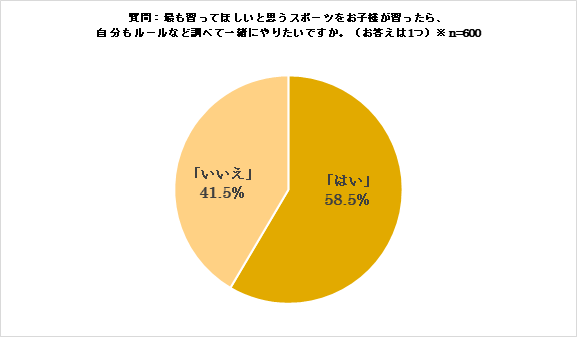 さらに、子どもが習うスポーツに関して自分自身もルールを調べて一緒にやりたいかと質問したところ、「はい(351票)」と答えた人が58.5%となり、「いいえ(249票)」を上回る結果となりました。このことから、子どもと一緒にスポーツを楽しみたい親が多いことも明らかになりました。
