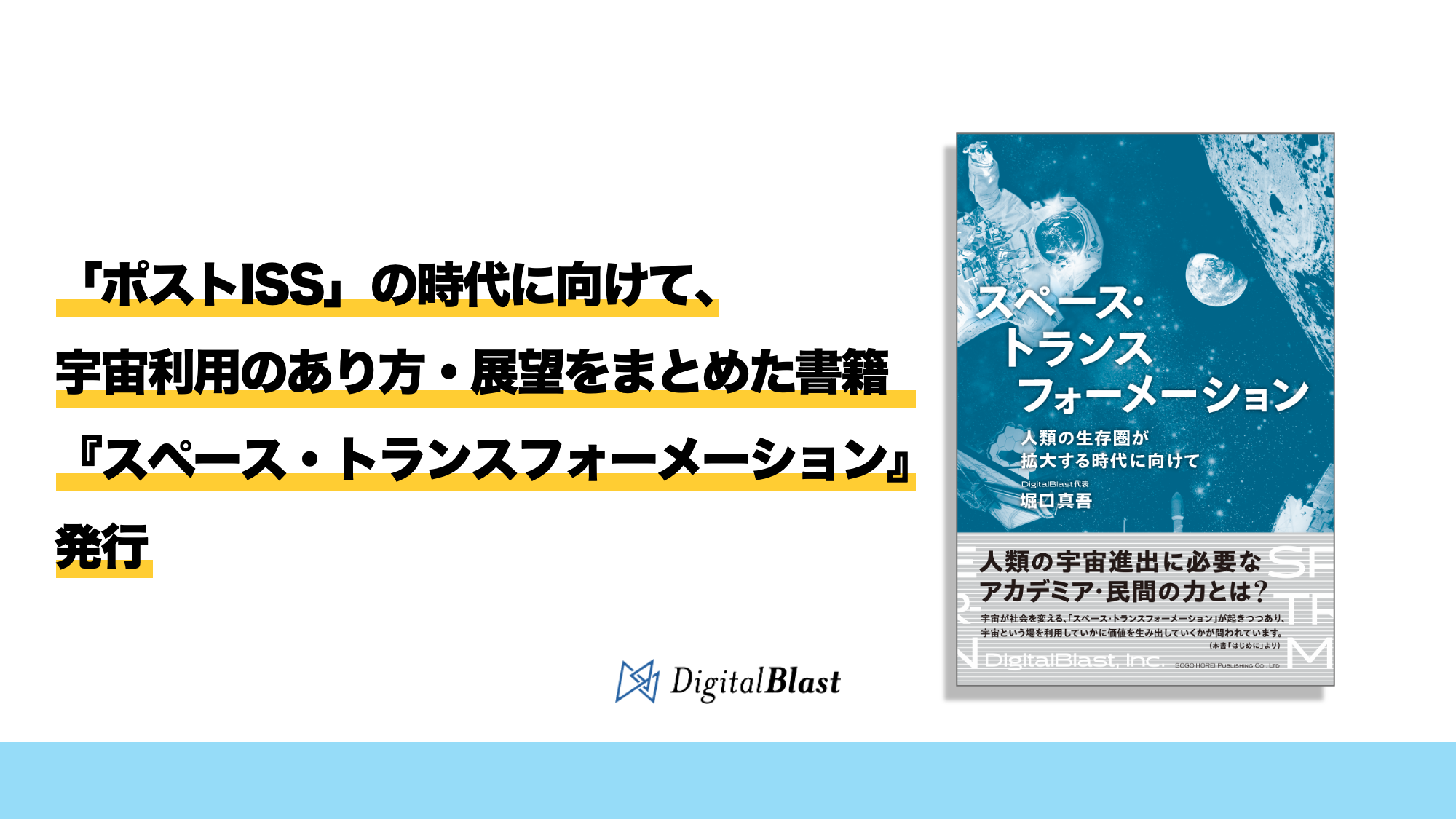 小型ライフサイエンス実験装置の開発や宇宙産業の活性化・新事業創出をサポートする株式会社DigitalBlast(東京都千代田区、代表取締役CEO:堀口真吾、以下DigitalBlast)は、2030年の国際宇宙ステーション(ISS)退役後の宇宙ビジネス・宇宙開発を見据えた書籍『スペース・トランスフォーメーション 人類の生存圏が拡大する時代に向けて』(総合法令出版)を、2024年7月上旬に発行する運びとなりましたことをお知らせいたします。
