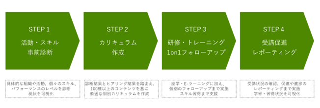 独自開発された活動・スキルの事前診断結果に基づきオーダーメイド型でカリキュラムを提供することで、自社によりマッチしたトレーニングを受講していただくことが可能となっています。