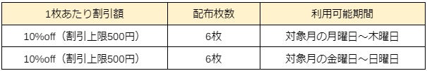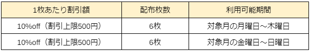 上記のクーポンコードをアプリへ入力すると、お客様のアカウントへ10%offクーポンが合計12枚付与されます。内訳は以下の通りです。