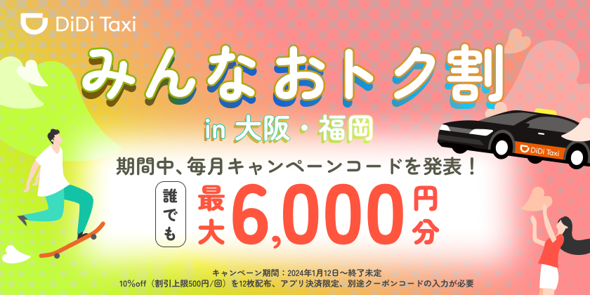 タクシーアプリ「DiDi」大阪・福岡で「みんなおトク割」を1月12日から開始