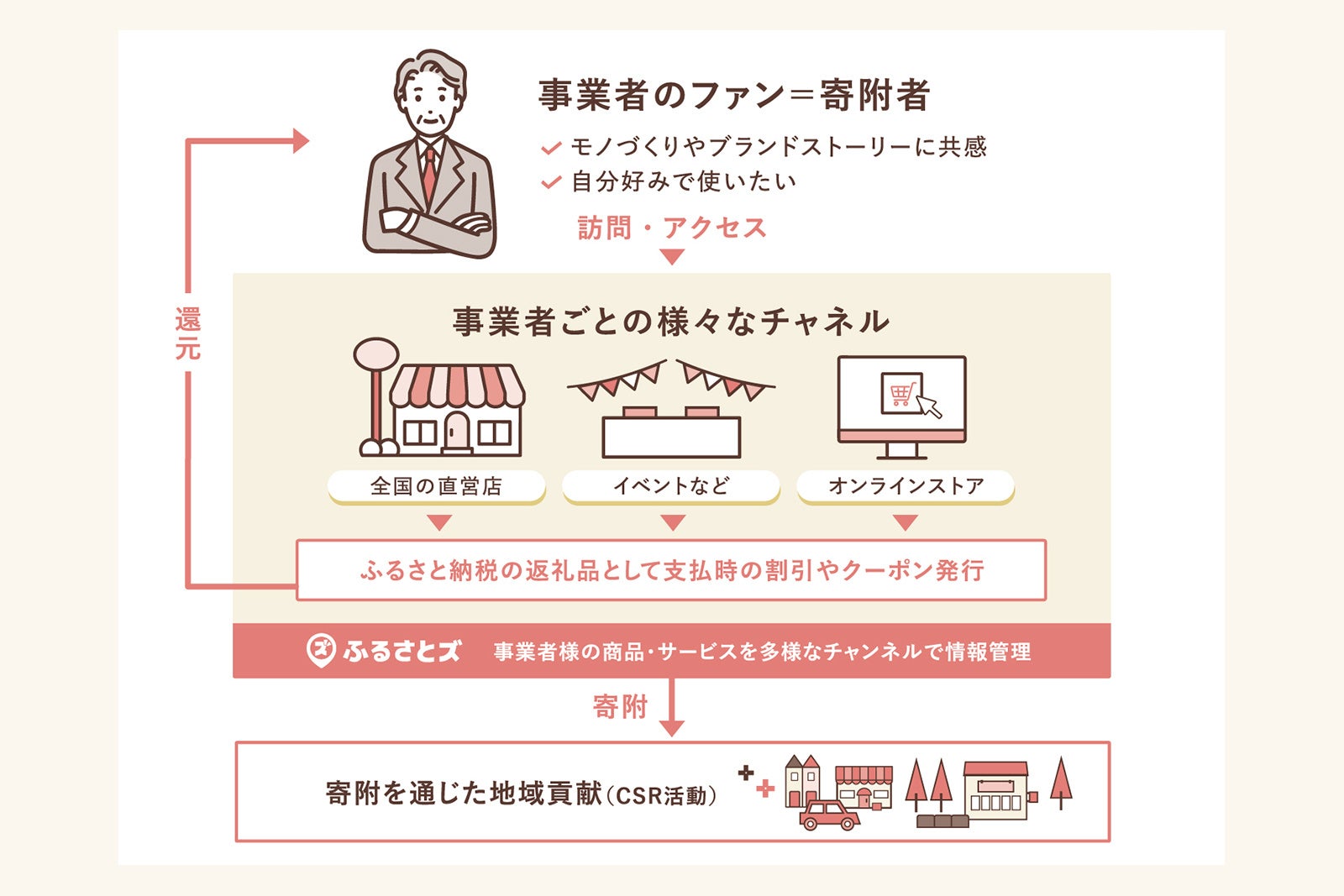 『ふるさとズ』は「店舗型ふるさと納税(R)」として、事業者(ブランドや店舗)を中心にサービス設計をしています。