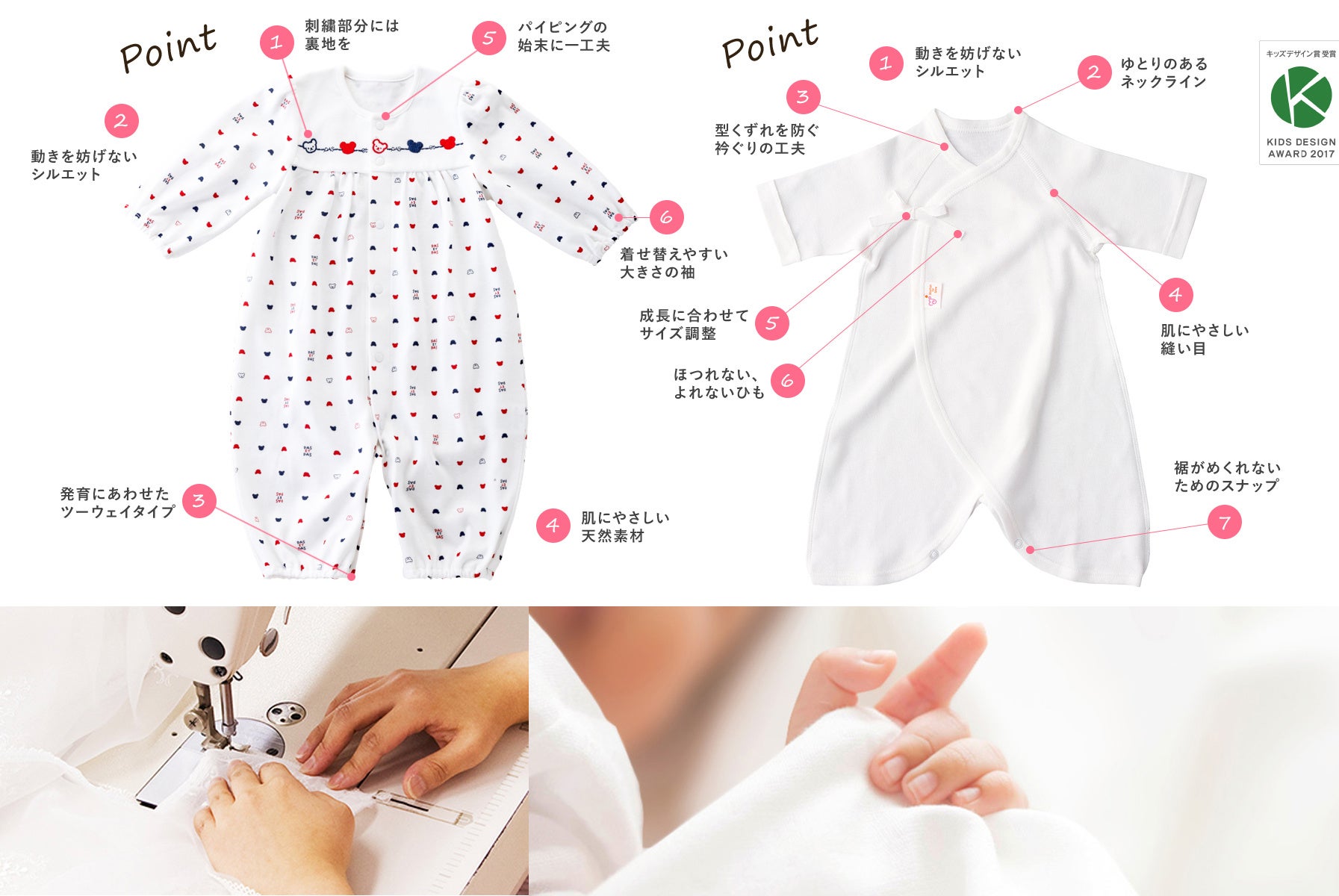 生まれたての素肌をつつむ優しい素材、着心地の良い縫製。