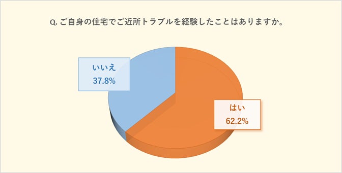 過半数を超える62.2%の方が、これまでにご近所トラブルを経験したことがあると回答しました。また、「戸建て住宅」「集合住宅」それぞれの回答結果を分けて見ても、ご近所トラブルの経験率においてほぼ差は見受けられませんでした。