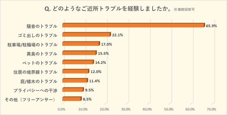トラブルの内容についてはゴミ出し・駐車場駐輪場・異臭など…様々な要因に分散して票が集まりましたが、唯一圧倒的な得票となったのは「騒音のトラブル」65.9%でした。
