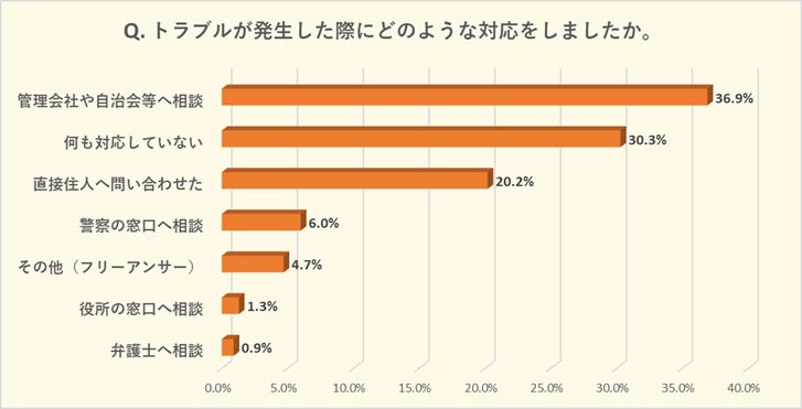3) トラブルが発生した際の対応では「管理会社や自治体への相談」36.9%が1位であるものの、続く2位は「何も対応していない」30.3%という結果に。