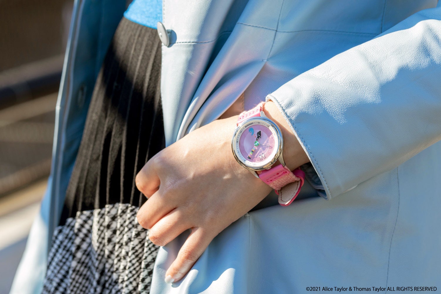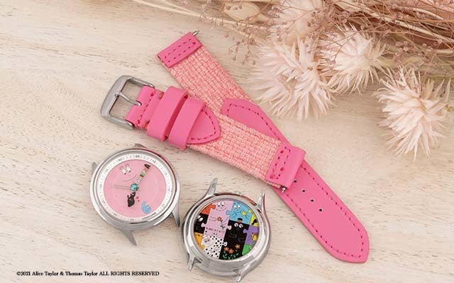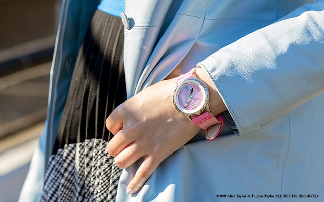 バーバパパを文字盤全体で表現したピンクの文字盤。立体的なインデックスにより、キャラクターの世界観の中にも視認性を確保しました。