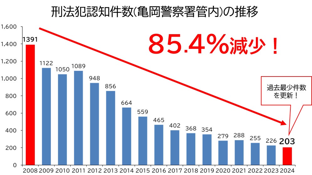 亀岡警察署管内の刑法犯認知件数の17年間の推移では、2008年1391件が、2024年は203件と過去最少件数を3年連続で更新。17年間で85.4%減少。