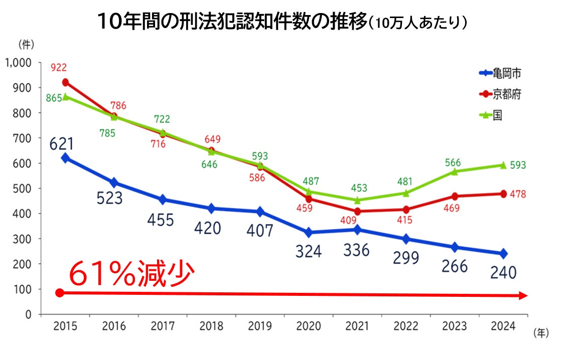 京都府亀岡市(市長:桂川孝裕)は、2008年に日本で初めてセーフコミュニティの国際認証を取得し、その後も安全・安心なまちづくりに向けた取り組みを継続する中、2024年中の刑法犯認知件数※が203件(暫定値)となり、3年連続で過去最少を更新しました。