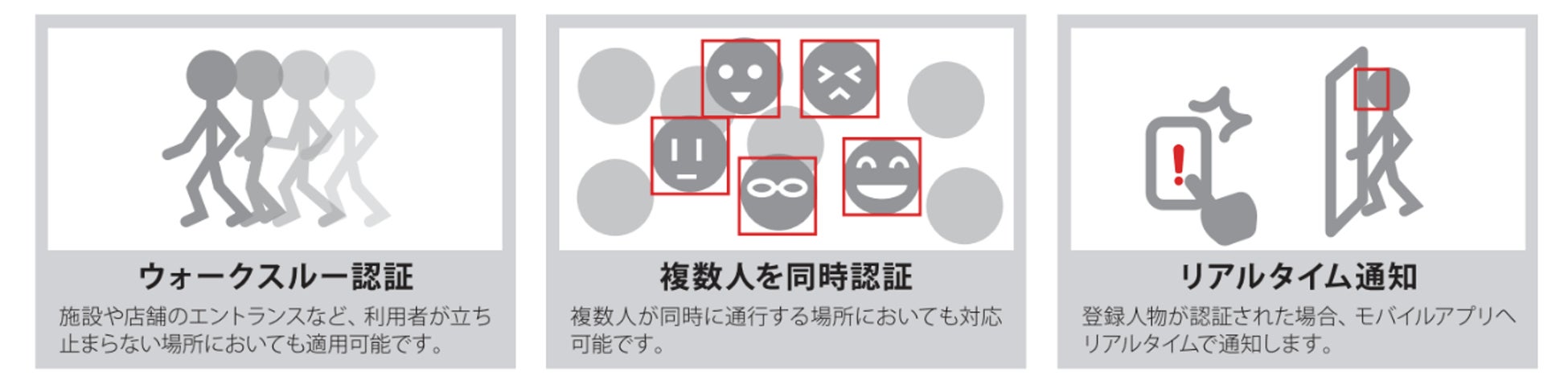 FaceTracker(フェイストラッカー)は、独自の顔認証技術により、監視カメラ映像に映った人物を瞬時に特定し、認証結果を通知することができるシステムです。施設や店舗のエントランスなど、利用者が立ち止まらない場所においても適用可能で、1台のカメラ映像上で最大5人の同時認証ができます。