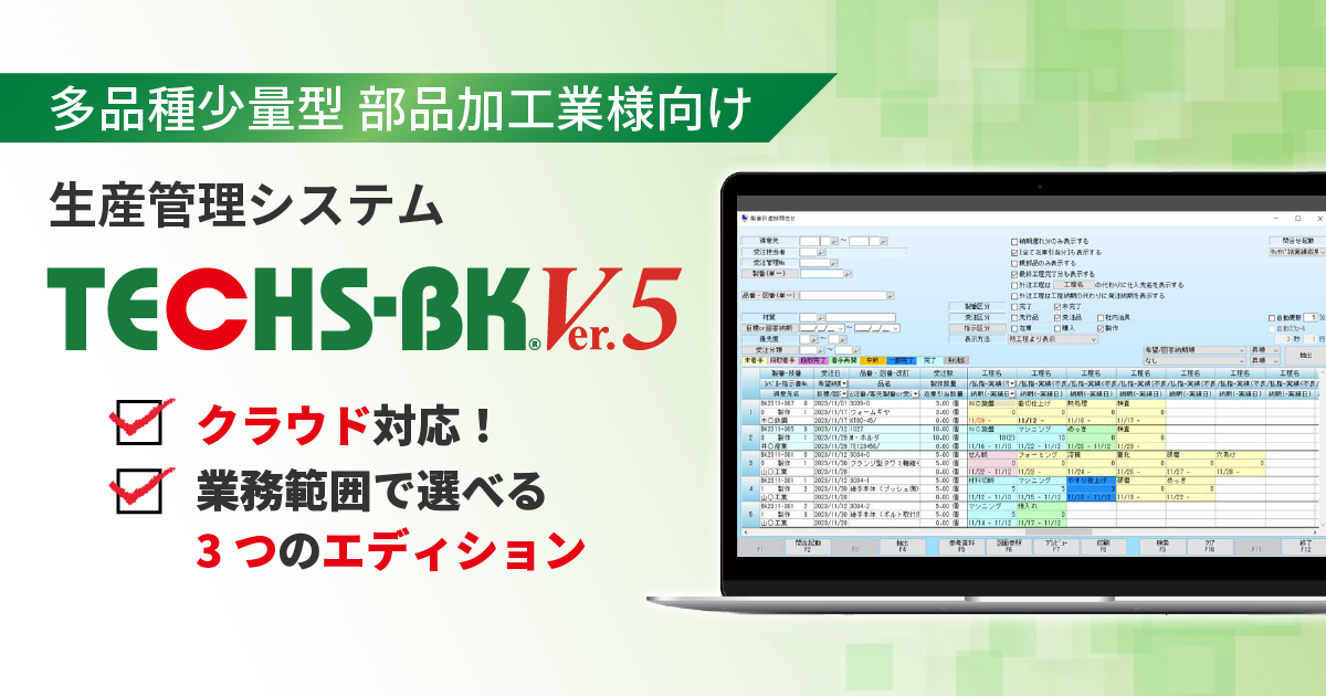 『TECHS-BK Ver.5.0(以下、TECHS-BK)』は、導入実績4,500社超の『TECHSシリーズ』の一つで、多品種少量型の部品加工業様向けに開発された生産管理システムです。