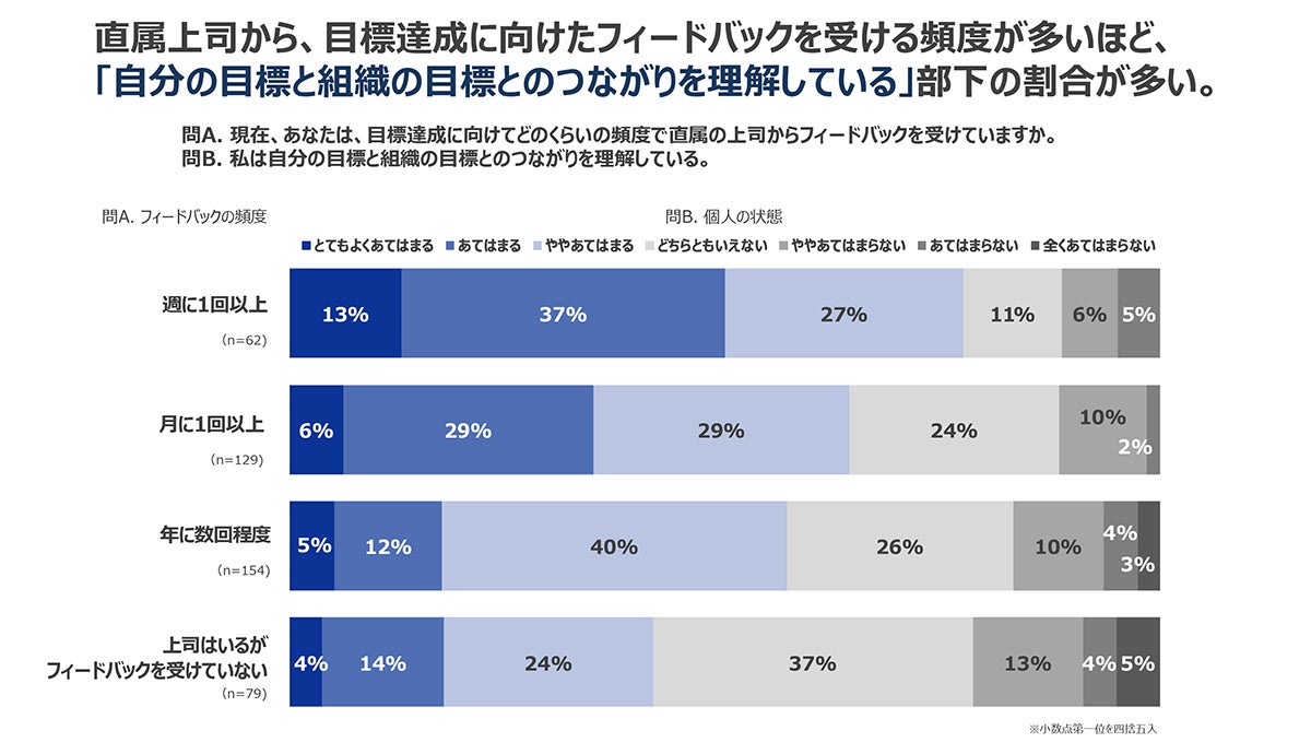 一方で、今回の調査では、目標達成に向けてフィードバックを受ける頻度が高い人ほど、「自分の目標と組織の目標とのつながりを理解している」割合が多いことも明らかになっています。