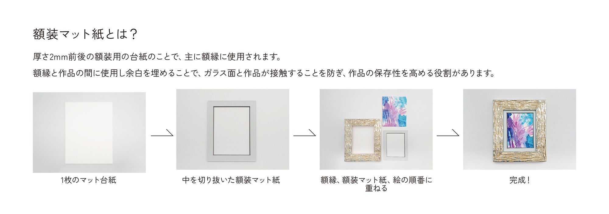 絵を額の中で保持する役目を持つマット紙は、変質しにくく耐久度の良い上質な紙です。