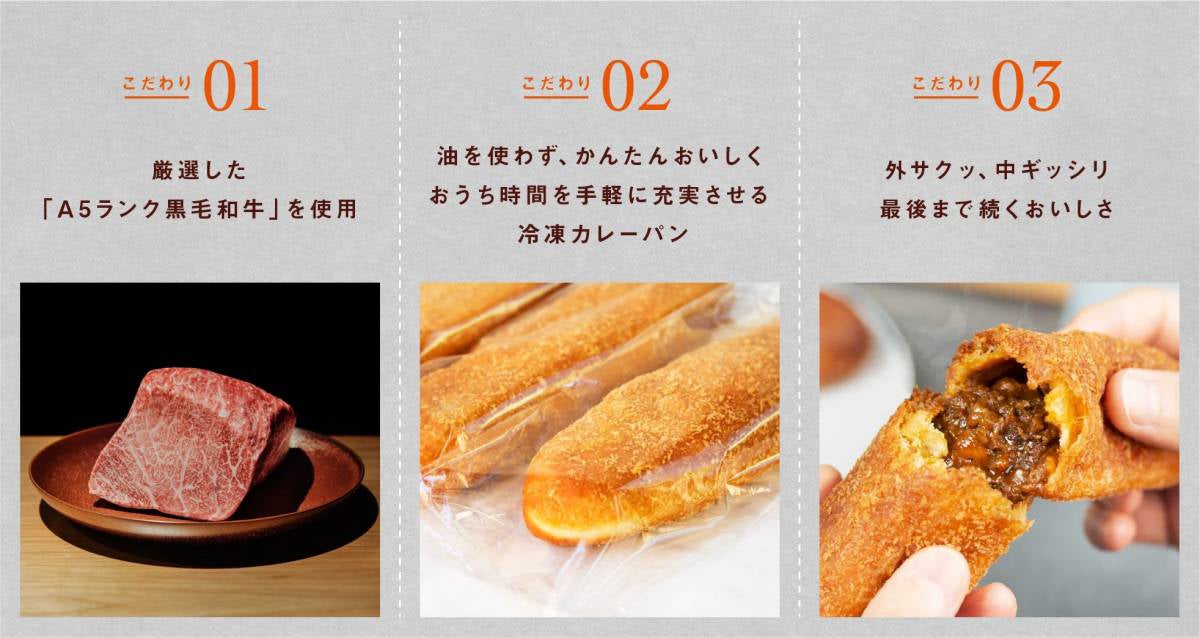 もとむのカレーパンは、“黒毛和牛の美味しさを追い求め”、“たくさんの人に求められる”ようなカレーパンを届けたいという想いを込めて誕生しました。東京の食文化の台所とも言われる築地の焼肉店「築地焼肉もとむ」の人気メニューの牛すじカレーをベースに、厳選した「A5ランク黒毛和牛」を、さくっと軽い食感のパンの中に贅沢に詰め込んだこだわりの逸品です。全長18cmのパンの中にA5ランクの黒毛和牛を贅沢に使用しています。独自の冷凍技術と揚げ&焼き製法でヘルシーに仕上げたさくっと軽い食感のカレーパンです。