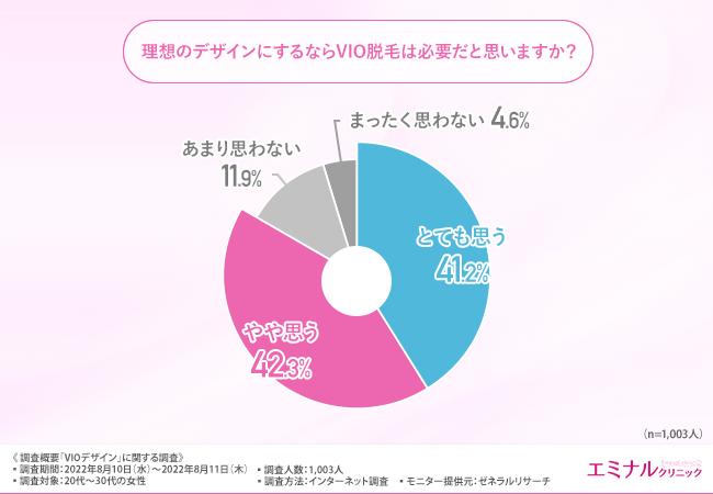 そこで、「理想のデザインにするならVIO脱毛は必要だと思いますか?」と質問したところ、『とても思う(41.2%)』と回答した方が最も多く、次いで『やや思う(42.3%)』『あまり思わない(11.9%)』『まったく思わない(4.6%)』と続きました。